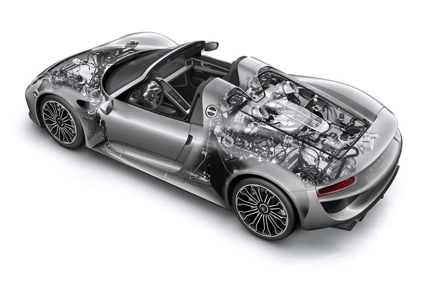 Αυτό αποτελείται από τον θερμικό κινητήρα V8 των 4.6 λίτρων απόδοσης 608 ίππων στις 9.150 σ.α.λ. και 1.280 Nm ροπής και τους δύο ηλεκτροκινητήρες, έναν στον εμπρός άξονα απόδοσης 129 ίππων και έναν στον πίσω ισχύος 156 ίππων. Η συνδυαστική ισχύς φτάνει τους 887 ίππους, ενώ οι ηλεκτροκινητήρες αντλούν την ενέργειά τους από μια υγρόψυκτη μπαταρία ιόντων λιθίου που μπορεί να φορτίσει σε μόλις 25 λεπτά μέσω του προαιρετικού ταχυφορτιστή της Porsche. Μάλιστα η 918 Spyder μπορεί να κινηθεί ως αμιγώς ηλεκτρικό για αποστάσεις έως 32 χιλιομέτρων, με ταχύτητες μέχρι 150 χλμ./ώρα και με επιτάχυνση στο 0-100 χλμ./ώρα σε λιγότερο από 7 δευτερόλεπτα.