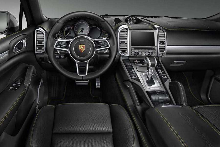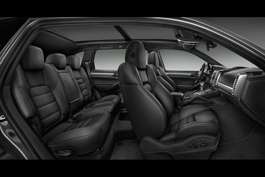 Στο εσωτερικό της μοναδικής Cayenne S E-Hybrid κυριαρχεί το μαύρο δέρμα με τις πράσινες ραφές, οι αλουμινένιες επενδύσεις στην κεντρική κονσόλα, τα ένθετα από ανθρακόνημα στις χειρολαβές και στα μασπιέ.