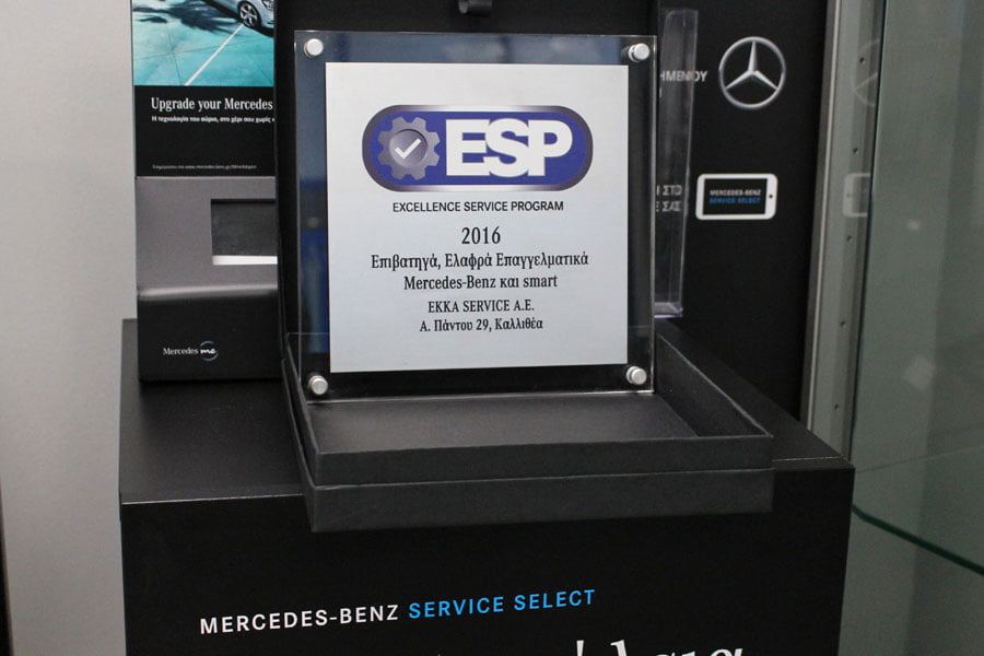 Αξίζει μάλιστα να τονιστεί ότι η EKKA Service ήταν ο μοναδικός Εξουσιοδοτημένος Επισκευαστής Mercedes-Benz και smart που κέρδισε το ESP ταυτόχρονα στα Mercedes, στα smart και στα ελαφρά επαγγελματικά. Γεγονός που αποδεικνύει το υψηλό επίπεδο του επαγγελματισμού, τη συνέπεια και την αφοσίωση της ομάδας της EKKA Service Καλλιθέας. κερδίσαμε το ESP ταυτόχρονα και στα Mercedes και στα smart και στα ελαφρά επαγγελματικά