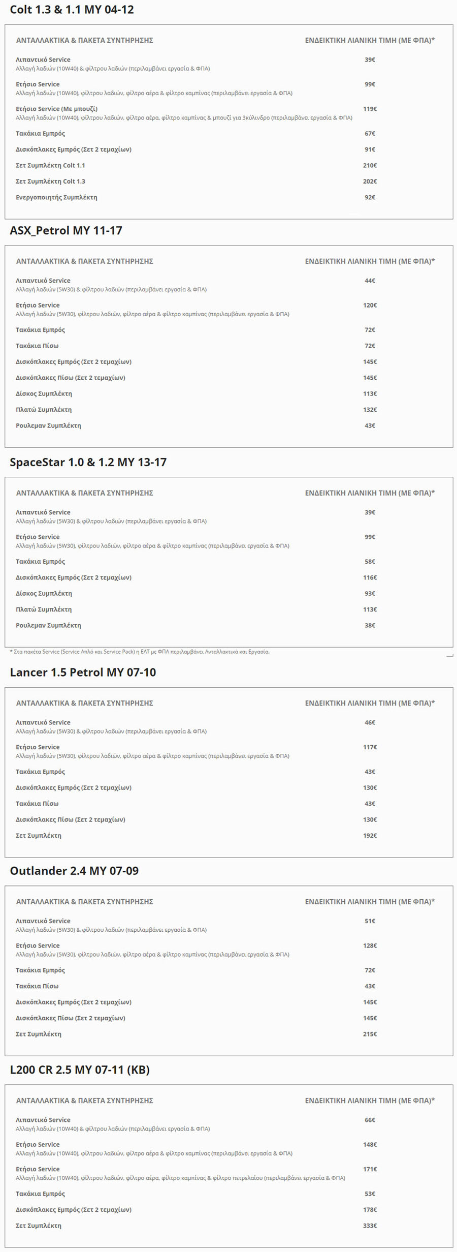 Στους παρακάτω πίνακες μπορείτε να δείτε ενδεικτικές λιανικές τιμές για ανταλλακτικά και πακέτα συντήρησης για ορισμένες από τις εκδόσεις των μοντέλων Colt, ASX, Space Star, Lancer, Outlander και L200. Για να δείτε τις τιμές για όλα τα μοντέλα Πατήστε Εδώ.