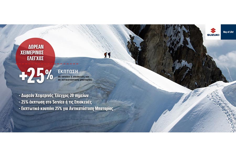 Η Suzuki για τους οδηγούς που προγραμματίζουν εκτός από τις χειμερινές τους διακοπές και την τακτική συντήρηση του αυτοκινήτου τους ή κάποια απαιτούμενη επισκευή προσφέρεται έκπτωση στα γνήσια ανταλλακτικά και τις εργασίες που απαιτούνται.