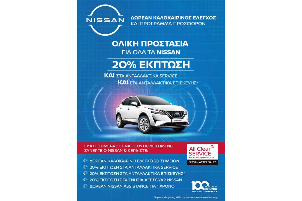 Το καλοκαίρι που έρχεται θα είναι πιο ξέγνοιαστο για τους κατόχους Nissan! Με το καλοκαιρινό πρόγραμμα προσφορών All Clear Service, η Nissan προσφέρει Ολική Προστασία για όλα τα Nissan, προνομιακές εκπτώσεις και όλη την απαραίτητη φροντίδα πριν από τις καλοκαιρινές εξορμήσεις.