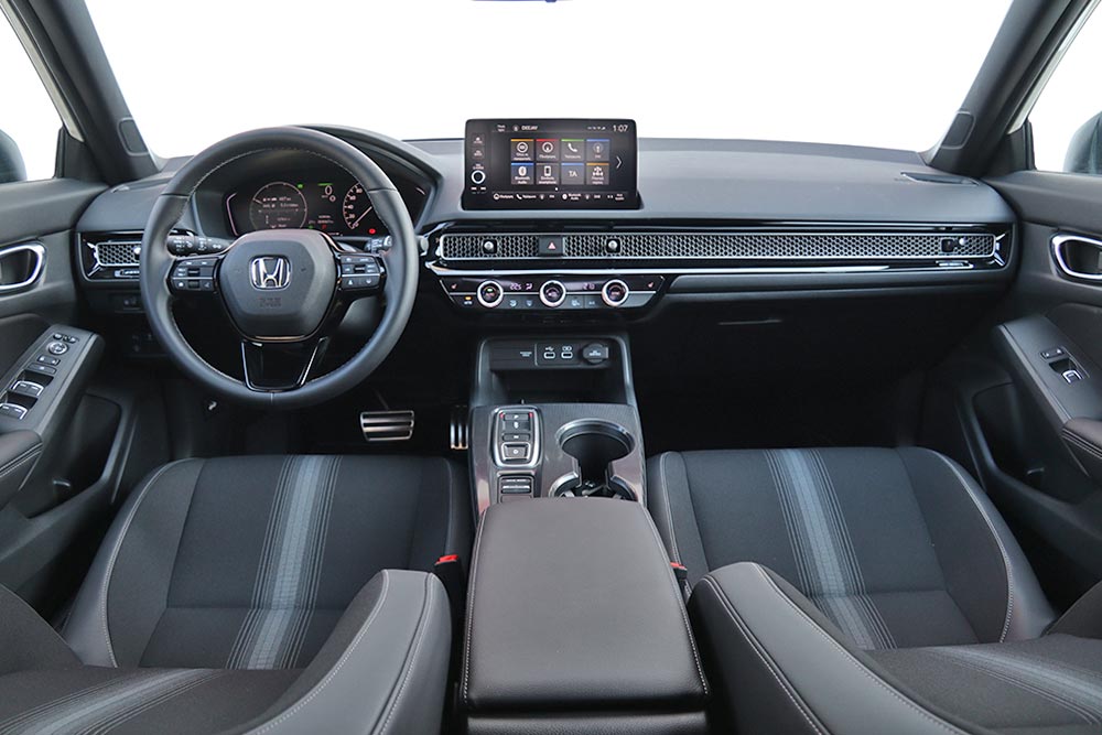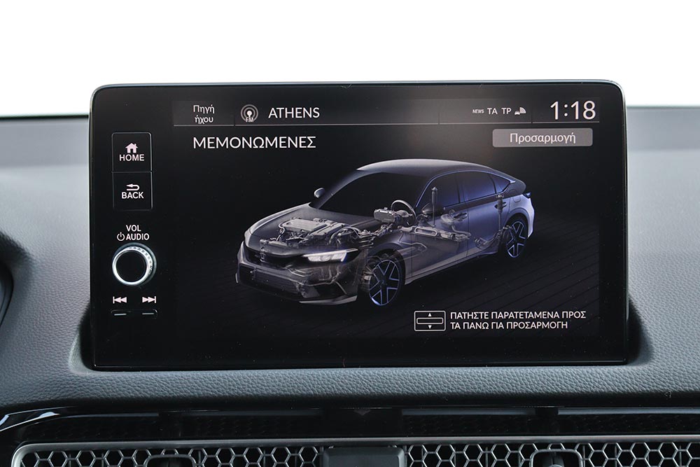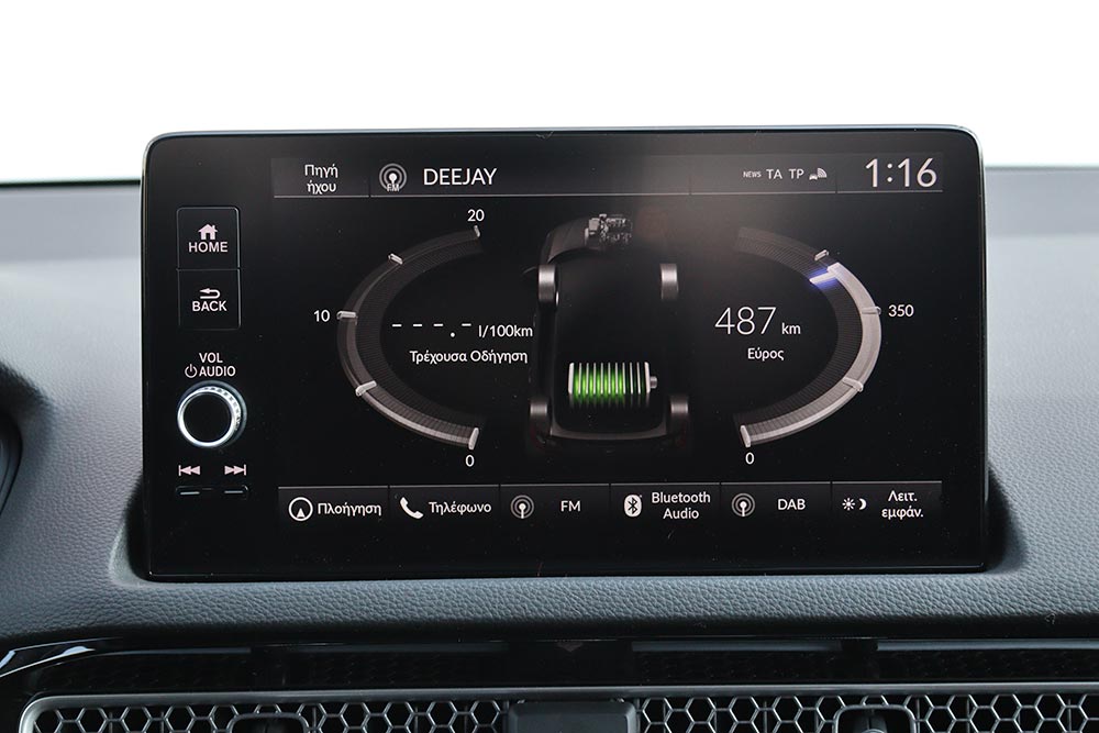 Άρτιο σε όλα τα επίπεδα είναι και το εσωτερικό του νέου Honda Civic e:HEV. Καταρχήν και αυτό είναι πολύ κομψό σχεδιαστικά με τις ευθείες γραμμές και τις επίπεδες επιφάνειες στο μινιμάλ ταμπλό. Οι οθόνες είναι φυσικά παρούσες, όπως είναι αυτή των 10,2 ιντσών του πίνακα οργάνων και των 9 ιντσών του infotainment με τα σύγχρονα γραφικά και τη γρήγορη απόκριση. Κορυφαία είναι η εργονομία, τόσο από τον εύκολο χειρισμό των διαφόρων χειριστηρίων, όσο και του μενού του συστήματος πολυμέσων. Ιδιαίτερη προσοχή έχει δώσει η Honda και στην ποιότητα κατασκευής, με τα μαλακά υλικά και σκληρά πλαστικά να είναι γεροδεμένα και με ελάχιστα διάκενα. Το πληρέστατο εσωτερικό του νέου Honda Civic e:HEV συμπληρώνει η ευρυχωρία που παρέχει σε όλους τους επιβάτες, όπως και το πορτ μπαγκάζ των 410 λίτρων με το μεγάλο άνοιγμα.