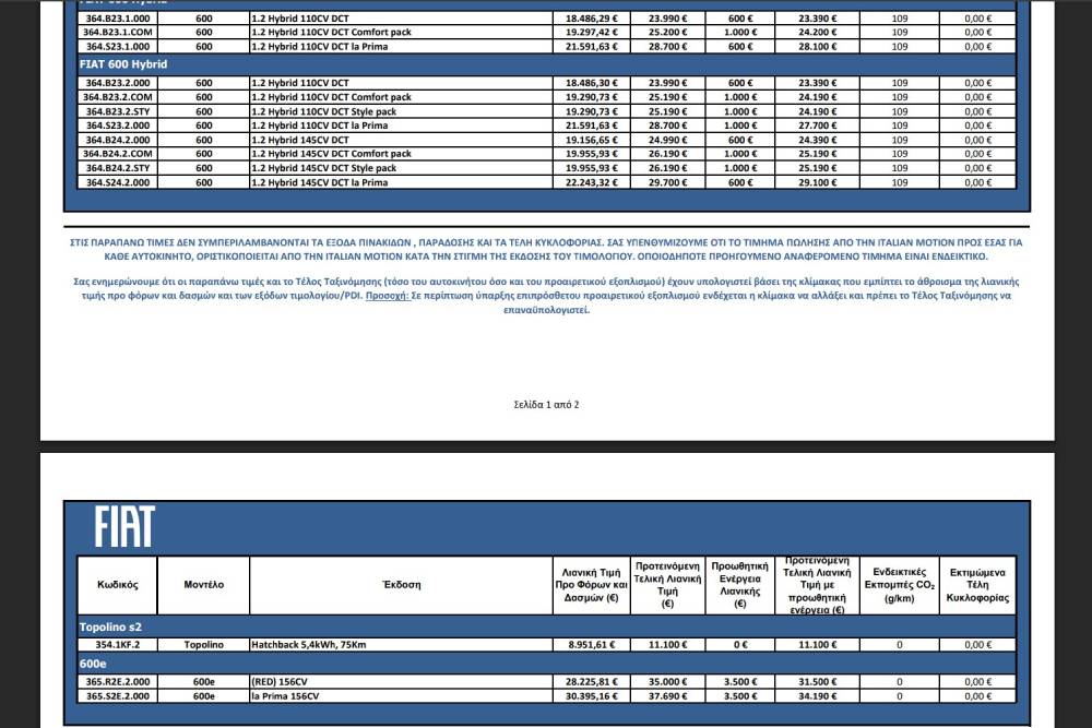 Συγκεκριμένα το 600 Hybrid ξεκινάει από τις 23.390 ευρώ (-600 ευρώ σε σχέση με πριν) με τον κινητήρα 1.2 Turbo Hybrid 100 hp e-DCT6, από 24.390 ευρώ (επίσης -600 ευρώ) με το πιο δυνατό μοτέρ 1.2 Turbo Hybrid 145 hp e-DCT6 και από 31.500 ευρώ (χωρίς την κρατική επιδότηση, αλλά με έκπτωση 3.500 ευρώ της Fiat) το αμιγώς ηλεκτρικό 600e 156 hp. Επίσης, έχει μηδενικό φόρο χρήσης εταιρικού αυτοκινήτου στις εκδόσεις των 100 hp πλην του Dolce Vita, στο βασικό των 145 hp και στο EV, ενώ καμία έκδοση δεν πληρώνει τέλη κυκλοφορίας. Πρόσθετα καλύπτεται με 5ετή εγγύηση για τα μηχανικά μέρη και ίσης διάρκειας οδική βοήθεια, όπως επίσης και με 8ετή εγγύηση (ή 160.000 χλμ.) για την μπαταρία υψηλής τάσης του 600e, ολοκληρώνοντας το κορυφαίο value for money που υπογραμμίζει τη μοναδική ιταλική φινέτσα.