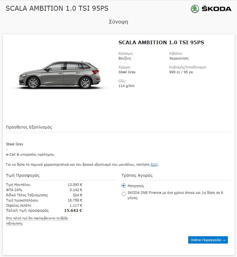 Παράλληλα, μέσω της  οnline παραγγελίας Skoda One Click, ο αγοραστής επωφελείται από τα προνόμια που ισχύουν για τα διαθέσιμα ετοιμοπαράδοτα αυτοκίνητα, όπως είναι σημαντικό όφελος τιμής, άτοκη χρηματοδότηση και 1η δόση μετά από 6 μήνες.
