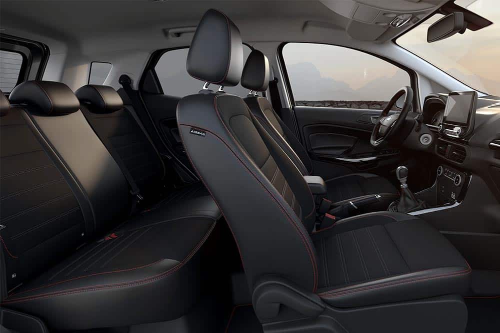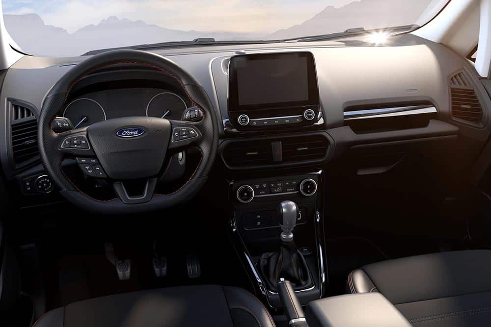 Το πλούσια εξοπλισμένο EcoSport ST-Line διαθέτει και αρκετές σπορ λεπτομέρειες εξωτερικά και στο εσωτερικό του. Η καμπίνα του έχει επιρροές από το Fiesta, ενώ αναβαθμίζεται από τις όμορφες επενδύσεις των καθισμάτων, τις κόκκινες ραφές, τα πεντάλ αλουμινίου και το λεπτό αφρώδες υλικό που καλύπτει το βαθύ ταμπλό. Οι χώροι που παρέχει είναι αρκετά ικανοποιητικοί για τέσσερις επιβάτες, όπως και το πορτ μπαγκάζ των 356 λίτρων.