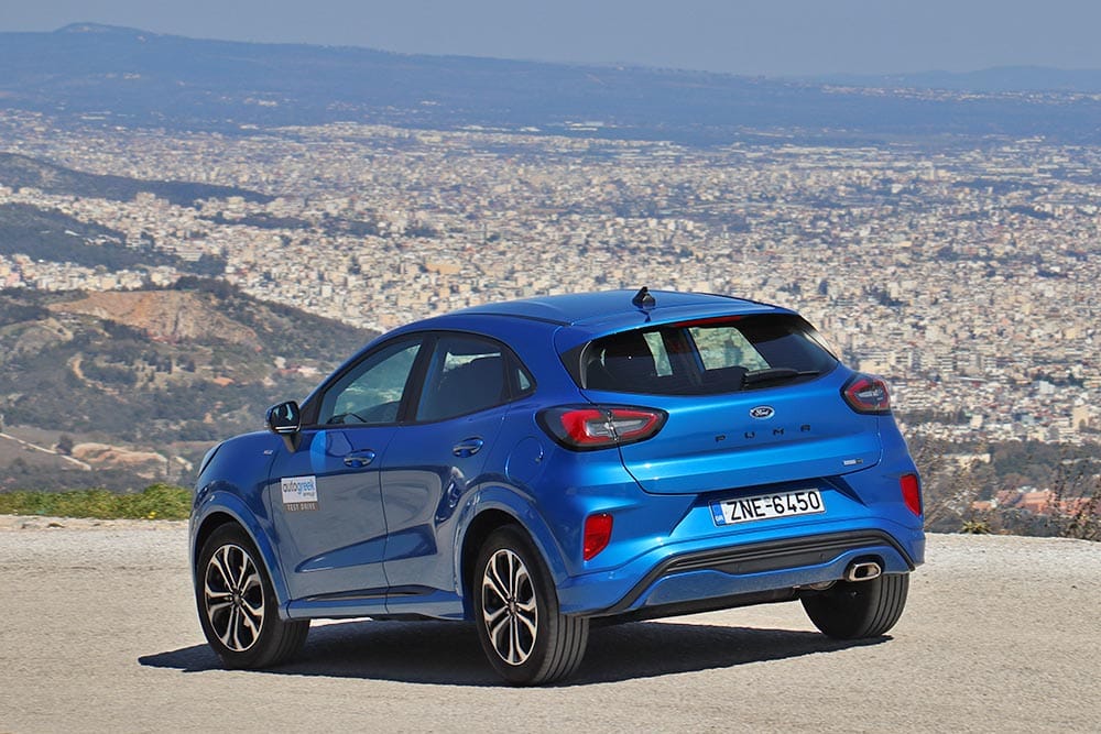 Αναφορικά με τα 1.000άρια turbo μηχανικά σύνολα, ακόμα και το αρχικό μοτέρ με τα 125 άλογα είναι επαρκέστατο για το Puma. Μαζί με το ήπιο υβριδικό σύστημα 48V που προσθέτει επιπλέον ισχύ 16 PS και έως +50 Nm ροπή, εξασφαλίζονται γρήγορες επιταχύνσεις (0-100 χλμ./ώρα σε 9,8 δλ.) με χαμηλές απαιτήσεις σε βενζίνη και εκπομπές CO2 από 121 γρ./χλμ. (μηδενικά τέλη κυκλοφορίας). Ο πιο δυνατός 1.0 EcoBoost με τα 155 άλογα διατηρεί την άριστη ελαστικότητα και γραμμικότητα με ακόμα ταχύτερες επιδόσεις (0-100 χλμ./ώρα σε 9,0 δλ.). Παράλληλα το Puma είναι πολύ ευχάριστο στην οδήγηση, ιδιαίτερα σταθερό και είναι ένα SUV με στήσιμο χάτσμπακ.
