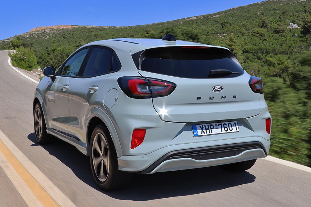 Ο γνωστός τρικύλινδρος κινητήρας 1.0 EcoBoost στην αρχική του έκδοση με τους 125 ίππους και τη ροπή των 170 Nm (210 Nm σε λειτουργία overboost), εξασφαλίζει σβέλτες επιδόσεις με χαμηλές απαιτήσεις σε βενζίνη. Με τη συνδρομή του 48V mild hybrid ενισχύεται το τράβηγμα και η ελαστικότητα από τις πολύ χαμηλές στροφές, ενώ ομαλοποιείται η λειτουργία του Stop/Start. To ραφιναρισμένο και γραμμικό αυτό μοτέρ επιταχύνει το Puma από στάση στα 100 χλμ./ώρα σε 9,8 δλ. και φτάνει τη μέγιστη ταχύτητα των 191 χλμ./ώρα. Η κατανάλωση σε μεικτές πραγματικές συνθήκες βρίσκεται στα 6,7 λτ./100 χλμ., ενώ με εκπομπές CO2 120 γρ./χλμ. (στο Titanium 6MT) τα τέλη κυκλοφορίας είναι μηδενικά. Με το Powershift αυτόματο κιβώτιο των 7 ταχυτήτων επιταχύνει στο 0-100 χλμ./ώρα σε 9,6 δλ., καίει 8 λτ./100 χλμ. (μέτρηση δοκιμής) και με εκπομπές CO2 128 γρ./χλμ. «πληρώνει» 82 ευρώ τέλη κυκλοφορίας.