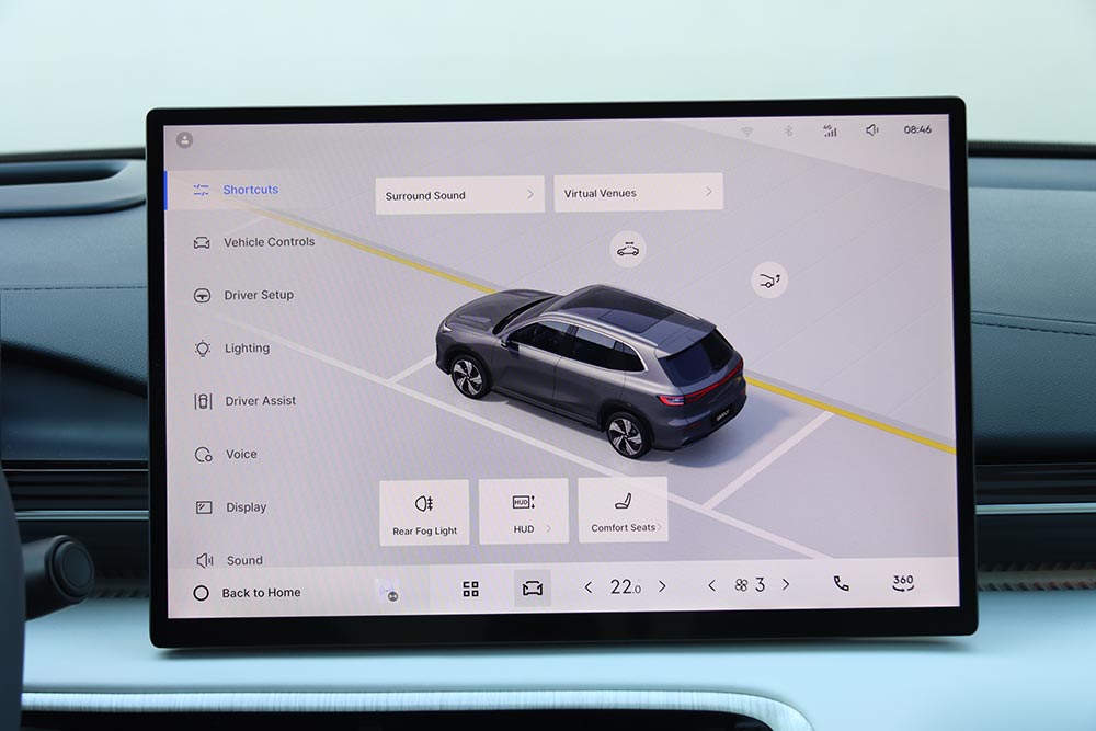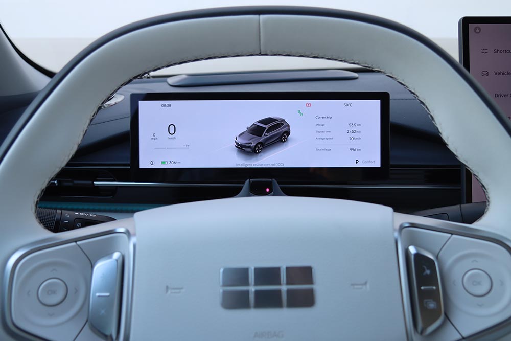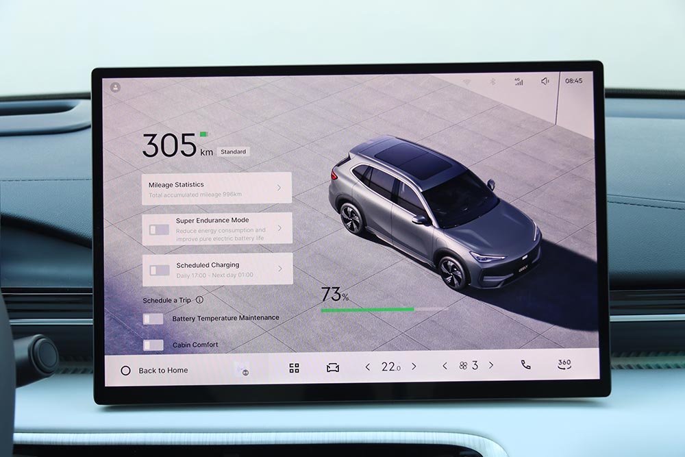 Πολύ θετικές κριτικές αποσπά και το εσωτερικό του, γιατί πέρα από το μοντέρνο του σχεδιασμό και την ψηφιακότητά του, διακρίνεται και για την πολυτέλεια που προσφέρει. Ειδικά στο δεύτερο επίπεδο εξοπλισμού Tech με τις λευκές δερμάτινες οικολογικές επενδύσεις και τη διχρωμία δείχνει -και είναι- ακόμα πιο premium. Επίσης, τα μαλακά υλικά στο ταμπλό, στις πόρτες και στην κονσόλα ενισχύουν περεταίρω την προσεγμένη ποιότητα κατασκευής, σε συνδυασμό με και με την πολύ γεροδεμένη συναρμογή. Η ευρυχωρία που παρέχει σε όλους τους επιβάτες, αποτελεί ένα ακόμα προσόν του Geely EX5, συν τους 33 συνολικά χώρους για μικροαντικείμενα. Στο πίσω κάθισμα τρία ψηλά άτομα θα κάτσουν χωρίς καμία παραχώρηση, μιας και έχουν στη διάθεσή τους πολύ αέρα για τα πόδια και το κεφάλι, μπόλικο πλάτος, επίπεδο δάπεδο και δύο ρυθμίσεις για την πλάτη του πίσω καθίσματος. Το πορτ μπαγκάζ με τη χωρητικότητα των 410 λίτρων δεν είναι από τα μεγάλα της κατηγορίας, παρόλα αυτά είναι άκρως ικανοποιητικό. Επιπλέον, κάτω από το δάπεδο βρίσκεται ένας ακόμα αποθηκευτικός χώρος 51 λίτρων.