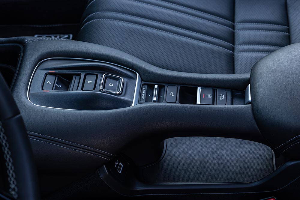Το εσωτερικό του ZR-V με το μοντέρνο σχεδιασμό και τα στοιχεία πολυτελείας παίρνει «άριστα» σε ποιότητα κατασκευής. Σε αυτό συμβάλλουν τα μαλακά τμήματα στο ταμπλό, στις πόρτες εμπρός/πίσω και στην κεντρική κονσόλα, σε συνδυασμό με ευχάριστο σε υφή συνθετικό δέρμα με ραφές σε πολλά τμήματα. Επίσης, η συναρμογή και το φινίρισμα βρίσκονται σε εξίσου κορυφαία επίπεδα. Στο κέντρο του ταμπλό και ψηλά είναι τοποθετημένη η 9άρα οθόνη του infotainment με την εύκολη χρήση χάρη στην πολύ καλά μελετημένη διάταξη του μενού και των εφαρμογών, συν το περιστροφικό χειριστήριο για τη ρύθμιση του ήχου που διευκολύνει περεταίρω. Στα πλεονεκτήματα του ZR-V e:HEV ανήκουν και οι άνετοι χώροι που παρέχει σε όλους τους επιβάτες του, μιας και στο πίσω κάθισμα θα βολευτούν και οι πιο ψηλοί. Μεγάλος σε άνοιγμα αλλά σχετικά ρηχός είναι ο χώρος αποσκευών των 390 λίτρων, ο οποίος φτάνει τα 1.322 λτ. εφόσον πέσουν οι πλάτες του πίσω καθίσματος.