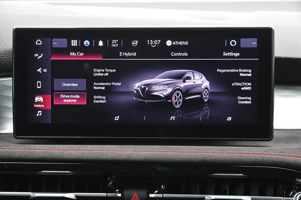 Υπάρχει και το ακόμα πλουσιότερο επίπεδο εξοπλισμού Veloce, με 42.900 ευρώ για την Tonale Hybrid 160 VGT (όφελος 1.600 ευρώ) και με 54.500 ευρώ την PHEV Q4 (όφελος 4.500 ευρώ). Επιπλέον της Sprint διαθέτει ζάντες 19 ιντσών, ηλεκτρονικά ρυθμιζόμενα αμορτισέρ, ενεργούς προβολείς Full LED Matrix, δερμάτινα ηλεκτρικά ρυθμιζόμενα, θερμαινόμενα και αεριζόμενα καθίσματα, κόκκινες δαγκάνες φρένων και χειριστήρια αλλαγής ταχυτήτων στην κολόνα του τιμονιού.