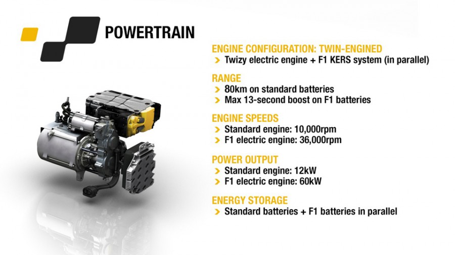 Το KERS που βρίσκεται στην θέση του πίσω καθίσματος, βάρους 30 κιλών, αυξάνει την απόδοση του ηλεκτροκινητήρα από τους 17 στους 97 ίππους, ενώ για 14 δευτερόλεπτα διατηρεί την ισχύ των 80 ίππων, εκτοξεύοντας το Twizy F1. Έτσι επιταχύνει στο 0-100 χλμ./ώρα στον ίδιο ακριβώς χρόνο με το Megane RS των 265 ίππων, δηλαδή σε μόλις 6 δευτερόλεπτα! Βέβαια η τελική του ταχύτητα «τερματίζει» στα 110 χλμ./ώρα και το βάρος του ανέρχεται στα μόλις 564 κιλά (έναντι 85 χλμ./ώρα και 473 κιλά του απλού Twizy).
