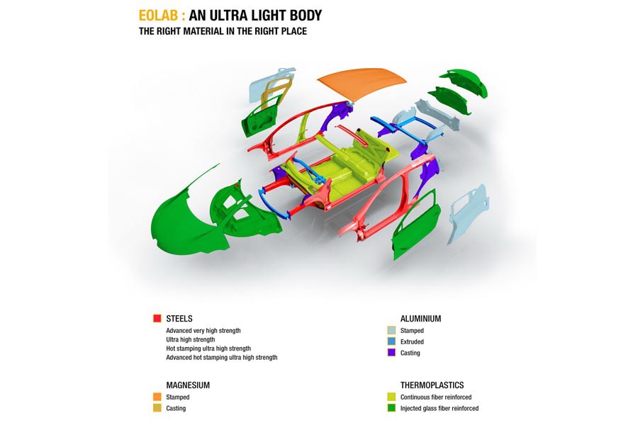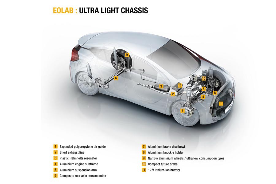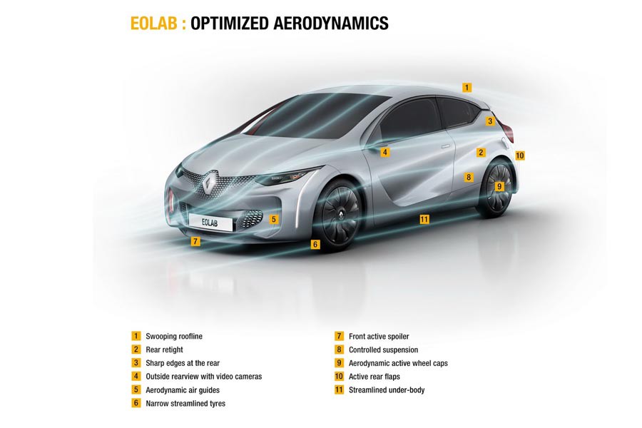 Ένα νέο φουτουριστικό πρωτότυπο παρουσιάζει η Renault, το EOLAB, το οποίο δείχνει το μικρό αυτοκίνητο της επόμενης δεκαετίας. Η ονομασία του προέρχεται από την σύνθεση των λέξεων Aeolous (ο θεός των ανέμων Αίολος) και Labatory (μτφ. εργαστήριο). Το πολύ αεροδυναμικό του αμάξωμα (Cd: 0,235) με τις 2+1 πόρτες ζυγίζει 955 κιλά χάρη στην χρήση πολύ ελαφριών υλικών στην κατασκευή του, όπως μαγνήσιο (η οροφή ζυγίζει μόλις 4,5 κιλά), αλουμίνιο και λεπτό αλλά πολύ ανθεκτικό ατσάλι. Επιπλέον, κάθε τμήμα του και μηχανικό εξάρτημα, από τα φρένα τα παράθυρα έως τα καθίσματα έχει δεχθεί εντατική «δίαιτα» με αποτέλεσμα να εξοικονομηθούν συνολικά 400 κιλά σε σχέση με ένα αντίστοιχο συμβατικής τεχνολογίας αυτοκίνητο.