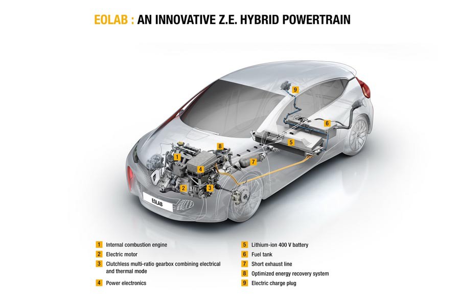 Για την τροφοδοσία του EOLAB υπάρχει ένας τρικύλινδρος 1.0 SCe κινητήρας βενζίνης απόδοσης 75 ίππων και 95 Nm ροπής, συνδυασμένος με ηλεκτροκινητήρα ισχύος 67 ίππων και 200 Nm ροπής. Το υβριδικό αυτό σύνολο, το οποίο καταναλώνει μόλις 1 λτ./100 χλμ. βενζίνης συνδυάζεται με αυτόματο κιβώτιο τριών ταχυτήτων, που μεταφέρει την κίνηση στους εμπρός τροχούς. Το ηλεκτρικό μοτέρ αντλεί ενέργεια από μια μπαταρία ιόντων – λιθίου 6,7 kWh, που επιτρέπουν την κίνηση του οχήματος αποκλειστικά με την ηλεκτρική ενέργεια για αποστάσεις έως 60 χιλιομέτρων.
