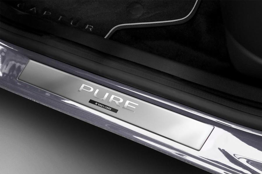 Η ειδική αυτή έκδοση του Captur ξεχωρίζει εξωτερικά από τη διχρωμία γκρι – μαύρου και τα διακοσμητικά μοτίβα στην οροφή και στους καθρέπτες. Στο εσωτερικό υπάρχουν σκουρόχρωμες δερμάτινες επενδύσεις και αριθμημένες πλακέτες στα μασπιέ. Το Captur Pure θα διατεθεί σε 1.000 αντίτυπα, σε τιμές Γαλλίας από 25.100 ευρώ, καθώς και σε εκδόσεις dCi 90 EDC από 25.300 ευρώ και από 23.800 ευρώ για το TCe 120 EDC.