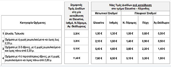 Η χρέωση στα μετωπικά διόδια Ελευσίνας και Ισθμού θα γίνεται πλέον και στις δύο κατευθύνσεις, με νέες τιμές όπως φαίνεται στον παρακάτω Πίνακα. Για την ασφάλειά τους οι οδηγοί παρακαλούνται να είναι ιδιαίτερα προσεκτικοί κατά την προσέγγιση στους εν λόγω σταθμούς και στις δύο κατευθύνσεις. Λειτουργία πλευρικών σταθμών στους ανισόπεδους κόμβους Νέας Περάμου και Πάχης Μεγάρων (στους κλάδους εξόδου από Κόρινθο και εισόδου προς Κόρινθο) και στον κόμβο Αγίων Θεοδώρων (στον κλάδο εξόδου από Αθήνα και στον κλάδο εισόδου προς Αθήνα). Οι τιμές διοδίων ανάλογα με την κατηγορία του οχήματος (και με ΦΠΑ 23%) διαμορφώνονται ως ακολούθως:
