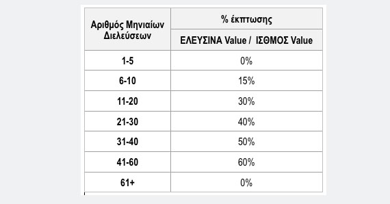 Κλιμακωτές εκπτώσεις από 15% έως και 60%, ανάλογα με τη συχνότητα διέλευσης από τους μετωπικούς σταθμούς Ελευσίνας ή Ισθμού (εκπτωτικά προγράμματα ΕΛΕΥΣΙΝΑ Value και ΙΣΘΜΟΣ Value), με βάση τον ακόλουθο πίνακα: