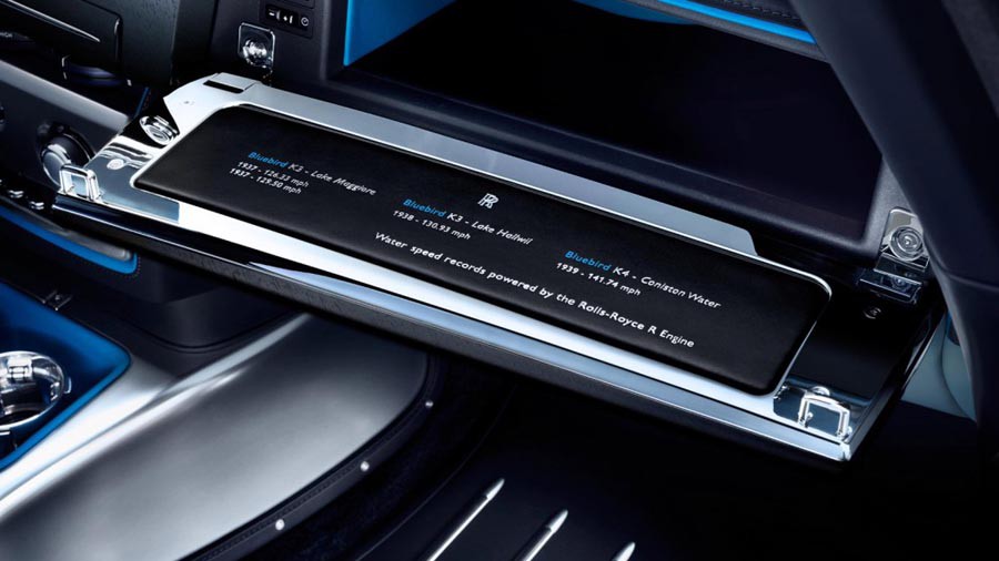 Η Rolls-Royce Phantom Drophead Coupe Waterspeed Collection φέρει μια σειρά από αποκλειστικά στοιχεία για τους 35 μοναδικούς πελάτες που θα διατεθεί. Μερικά από αυτά είναι το ειδικό χρώμα του αμαξώματος «Maggiore Blue» με τις 9 στρώσεις(!), το οποίο συναντάται για πρώτη φορά στην ιστορία της Rolls-Royce και στον κινητήρα. Παράλληλα η ίδια απόχρωση υπάρχει σε τμήματα του εσωτερικού και στις γυαλισμένες ζάντες με τις 11 ακτίνες. Επιπλέον, στο εσωτερικό όλες οι επενδύσεις από ματ ατσάλι είναι χειροποίητες και κάποιες από αυτές είναι χτυπημένες στο χέρι για 70 ώρες. Ξεχωριστά στοιχεία αποτελούν ακόμα ο φωτισμός του πίνακα οργάνων με μπλε και κίτρινο και το στο αναλογικό ρολόι όπως στο σκάφος Bluebird K3, ενώ στο ντουλαπάκι του συνοδηγού υπάρχει μια πλακέτα που αναφέρει για τα ρεκόρ ταχύτητας των σκαφών Bluebird K3/K4.