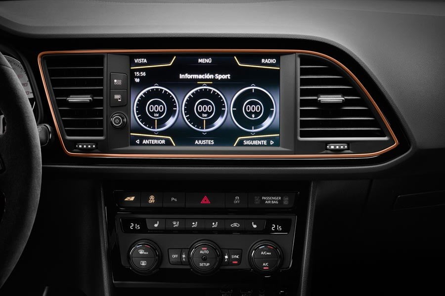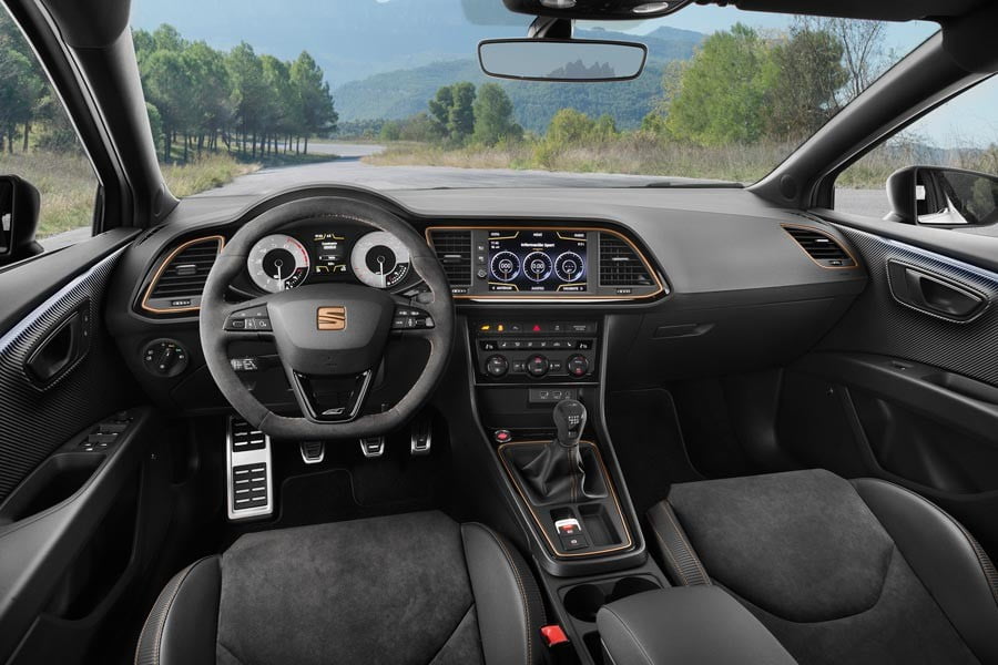 Στο εσωτερικό του Leon Cupra R συναντούμε επενδύσεις από ανθρακόνημα και χρωματισμούς σε χαλκό, μαζί με ένα πιο σπορ τιμόνι υπενδεδυμένο με αλκαντάρα, αλλά και αντίστοιχη επένδυση για τον επιλογέα ταχυτήτων.