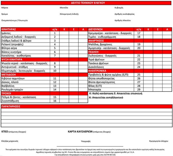 Στο Service Mr.France, μπορείτε να εμπιστευτείτε κάθε σας επιθυμία, όπου με προηγμένες μεθόδους και σύγχρονες τακτικές, εξασφαλίζεται η υψηλότερη ποιότητα υπηρεσιών. Για τη δική σας σιγουριά και ασφάλεια το Service Mr.France έφερε δωρεάν την Επαναστατική Υπηρεσία Τεχνικού Ελέγχου 29 Σημείων του αυτοκινήτου σας. Αυτή περιλαμβάνει ελέγχους σε διάφορα μέρη του αυτοκινήτου, όπως είναι στον κινητήρα, στη μετάδοση, στους τροχούς, στις αναρτήσεις, στα ηλεκτρονικά και στα συστήματα διεύθυνσης και πέδησης (βλ. παρακάτω το Δελτίο Τεχνικού Ελέγχου).