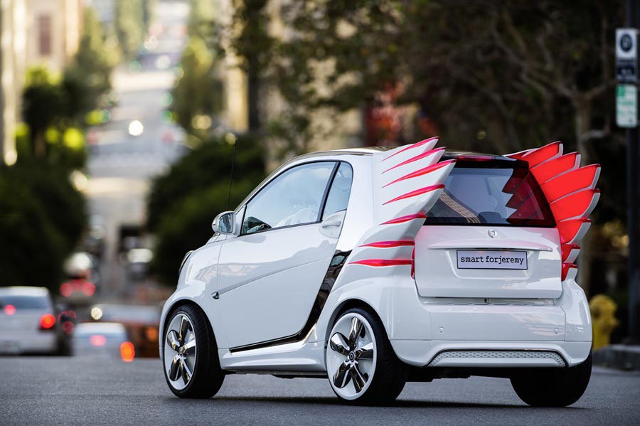 Ιδιαίτερα εκκεντρική αισθητική παρουσιάζει το ηλεκτροκίνητο smart forjeremy, με τα φτερά στο πίσω μέρος του, τα οποία αποτελούν σήμα κατατεθέν του Αμερικάνου σχεδιαστή μόδας Jeremy Scott. Ο τελευταίος επιμελήθηκε την «ενδυμασία» του μίνι μοντέλου, ενώ έχει ντύσει πολλούς γνωστούς καλλιτέχνες όπως είναι η Madonna, η Rihanna, η Katy Perry, η Bjork, η Beyonce, η Britney Spears κ.α. Τα… πτερύγια που μοιάζουν σαν εκτοξευμένες ρουκέτες φωτίζονται σε κόκκινο χρώμα και έτσι γίνονται ακόμα πιο εντυπωσιακά. Πολλές στιλιστικές επεμβάσεις έχουν γίνει στο υπόλοιπο τμήμα του αμαξώματος και στο λευκό εσωτερικό με τις πολλές επενδύσεις χρωμίου και δέρματος. Το forjeremy θα λανσαριστεί από το επόμενο έτος σε περιορισμένη παραγωγή.