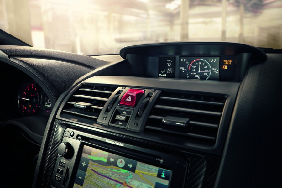 Το εσωτερικό του είναι ίσως πιο ενδιαφέρον προβάλλοντας έντονα σπορτίφ στοιχεία όπως το flat botommed νέο τιμόνι, τα αλουμινένια πεντάλ, τα σπορ καθίσματα και τις δυο οθόνες στην κεντρική κονσόλα. Εκείνη μάλιστα στο πάνω μέρος είναι 3,5 ίντσες σε μέγεθος και προβάλλει στοιχεία που αφορούν και τον κινητήρα (όπως πίεση turbo κ.α). Ο πίνακας οργάνων είναι και εκείνος σπορτίφ αισθητικής και ενσωματώνει οθόνη πληροφοριών στο κέντρο, ενώ οι στρογγυλοί διακόπτες του συστήματος κλιματισμού και η σχεδίαση του κάτω μέρους της κονσόλας δεν ξεφεύγουν από την σχεδίαση του προηγούμενου Impreza.