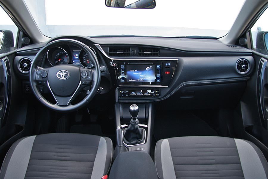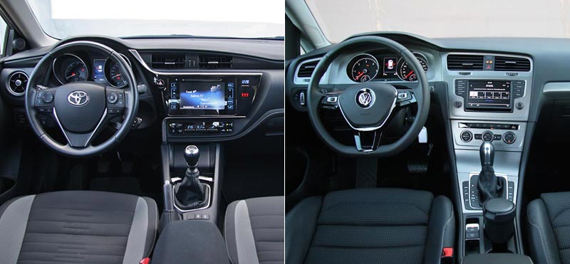 Το εσωτερικό του Toyota Auris διαθέτει μια αρκετά μοντέρνα σχεδίαση, με εντελώς κάθετο ταμπλό στο οποίο ξεχωρίζει η παρουσία της οθόνης του συστήματος πολυμέσων με τα πλήκτα αφής πάνω στην κονσόλα, αλλά και η οθόνη TFT των 4,2 ιντσών με μπλε-λευκό φωτισμό μέσα στον πίνακα οργάνων. Η εργονομία βρίσκεται σε πολύ καλά επίπεδα χωρίς να υπάρχει κάποιο ατόπημα, ενώ ποιοτικά υπάρχουν μαλακά υλικά καλής ποιότητας στο πάνω μέρος του ταμπλό, με αντίστοιχα πολύ καλό φινίρισμα και συναρμογή σε όλες τις επενδύσεις. Στο Golf από την άλλη, η εικόνα στο εσωτερικό είναι η τυπική VW, με λιτή συνολικά σχεδίαση, αλλά επίσης πολύ καλή εργονομία για όλους τους διακόπτες και την απαιτούμενη πλέον οθόνη αφής για το σύστημα πολυμέσων. Στο πεδίο της ποιότητας, υπάρχει περισσότερης έκτασης παχύ αφρώδες υλικό που καλύπτει ολόκληρο το ταμπλό και το εσωτερικό των θυρών σε σχέση με το εσωτερικό του Auris, ενώ απροβλημάτιστη είναι και η γενικότερη συναρμογή.