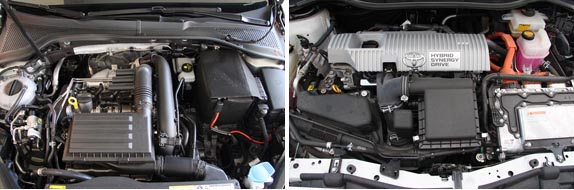 Το μόνο κοινό στοιχείο των δύο κινητήρων είναι ότι καίνε βενζίνη, ωστόσο όπως αναφέραμε το Golf μπορεί να χρησιμοποιεί και το σημαντικά φθηνότερο φυσικό αέριο (σχεδόν 1€/kg). Το μηχανικό σύνολο του Golf είναι άμεσου ψεκασμού turbo με απόδοση 110 ίππων και 200 Nm ροπής, το υβριδικό σύνολο του Auris αποτελείται από κινητήρα 1.8 λτ. VVT-i και ηλεκτροκινητήρα, συνδυαστικής απόδοσης 136 ίππων. Στην πράξη όμως το μοτέρ του Golf δείχνει ισχυρότερο και επιταχύνει στον ίδιο χρόνο στο 0-100 χλμ./ώρα με το δυνατότερο κατά 26 ίππους Auris HSD (10,9 δλ.), ενώ το VW κερδίζει σε τελική ταχύτητα (194 χλμ./ώρα έναντι 180 χλμ./ώρα).