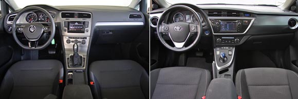 Στο εσωτερικό των δύο δημοφιλών μικρομεσαίων αυτοκινήτων, το Volkswagen κερδίζει αμέσως τις εντυπώσεις στον τομέα της ποιότητας, αφού τα υλικά του είναι ανώτερα από εκείνα του Auris και έχει δοθεί περισσότερη προσοχή σε κάθε λεπτομέρεια και γενικότερα αποπνέει πιο συμπαγή αίσθηση. Παράλληλα ο οδηγός του Golf νιώθει αμέσως «ένα» με το αυτοκίνητο, ενώ όπως και στο Auris η εργονομία είναι εξαιρετική. Από πλευράς χώρων για τους επιβάτες, το Golf είναι πιο ευρύχωρο στο εσωτερικό του, όμως το Auris έχει μεγαλύτερο χώρο αποσκευών (360 λτ. έναντι 291 λτ. το Golf), λόγω της ύπαρξης των δεξαμενών αποθήκευσης του φυσικού αερίου στο VW.