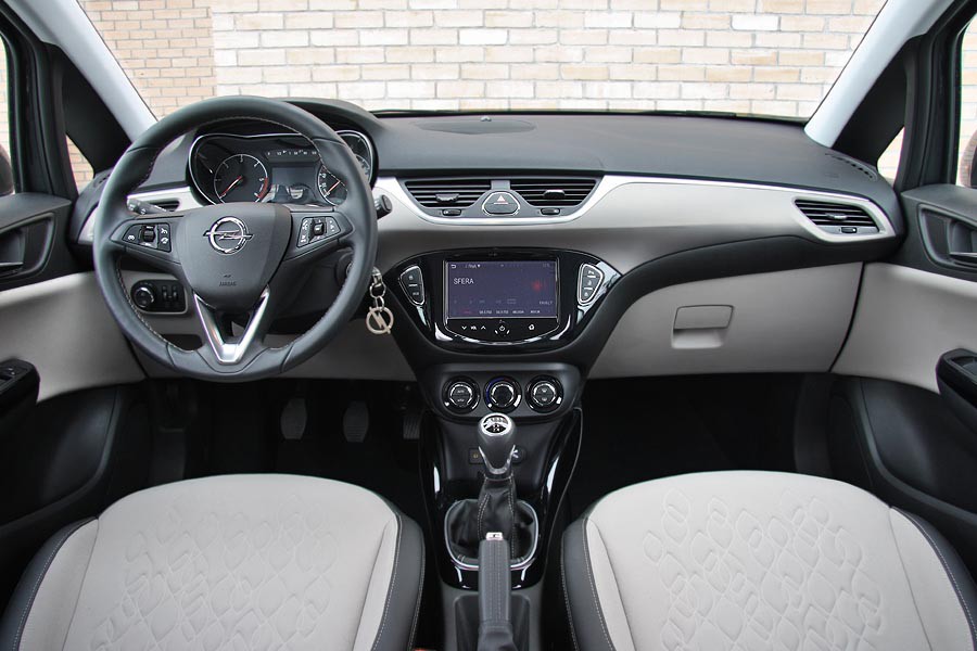 Στο νέο Corsa το εσωτερικό του είναι πλήρως αναβαθμισμένο τόσο σε σχεδίαση όσο και σε ποιότητα. Αρχικά τις εντυπώσεις κερδίζει με το νέο ταμπλό το οποίο στο πάνω μέρος του έχει μαλακό στην υφή υλικό πολύ καλής ποιότητας, ενώ πολύ προσεγμένη είναι η συναρμολόγηση των επιμέρους τμημάτων. Η εργονομία είναι καλή προς όλα τα χειριστήρια με το (προαιρετικό) σύστημα infotainment ΙntelliLink να διαθέτει οθόνη αφής 7 ιντσών. Η θέση οδήγησης είναι σχετικά ψηλά τοποθετημένη και ελαφρώς άβολη αφού τα καθίσματα είναι σκληρά και ενδεχομένως να αποδειχθούν και στενά για εύσωμα άτομα. Οι χώροι δεν έχουν αλλάξει συγκριτικά με εκείνους της προηγούμενης γενιάς Corsa, αφού άλλωστε και οι διαστάσεις του αυτοκινήτου παραμένουν αμετάβλητες, προσφέροντας έτσι πιο πολλές ανέσεις για τους επιβάτες και τις αποσκευές από το μικρότερο Polo.