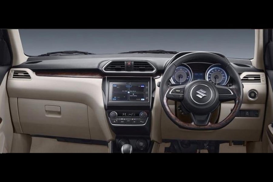 Στο εσωτερικό του Dzire η μόνη σχεδιαστική διαφορά από το Swift εντοπίζεται στους αεραγωγούς της κεντρικής κονσόλας, ενώ ο διάκοσμος διακρίνεται από τις επενδύσεις ξύλου στο ταμπλό, τιμόνι και πόρτες, καθώς και από τη διχρωμία μπεζ – μαύρου. Αναμενόμενα ο χώρος αποσκευών έχει μεγαλώσει και διαθέτει 376 λίτρα χωρητικότητας (έναντι 265 λτ. το Swift).