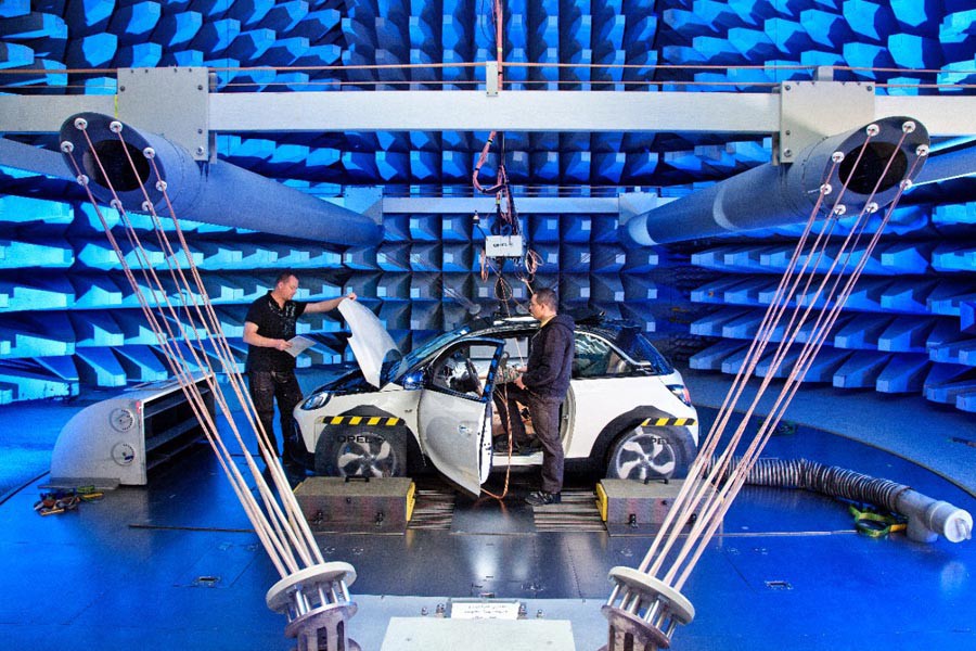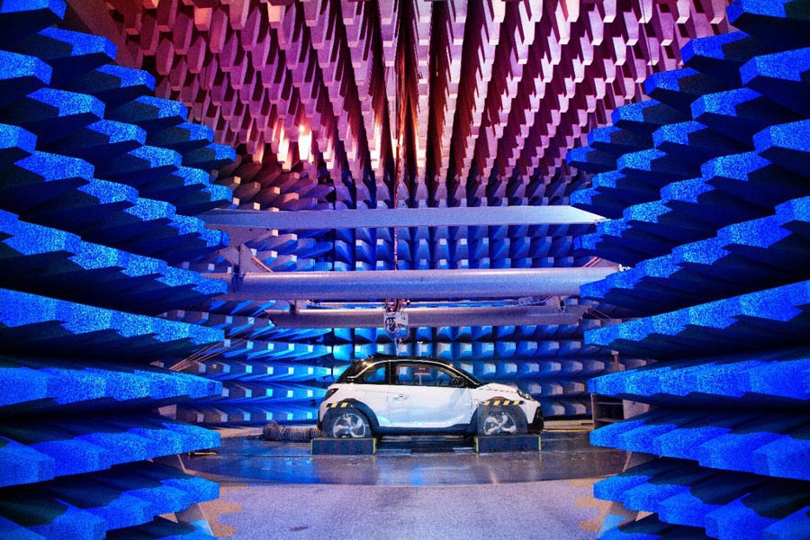 Γι’ αυτό, το ADAM ROCKS είχε ένα τελευταίο ραντεβού με το EMC Center. Αυτό που εκ πρώτης όψεως φαίνεται σαν μία τεράστια αυγοθήκη μετατρέπεται σε θαύμα απορρόφησης ακτινοβολίας. Οι ειδικά εξοπλισμένες αίθουσες του Κέντρου πληρούν τα πρότυπα ποιότητας επαγγελματικών εργαστηρίων δοκιμών τα οποία εφαρμόζει ο Γερμανικός Οργανισμός Διαπίστευσης σύμφωνα με ISO 17025. Εκεί, η ομάδα μηχανικών της Opel δοκιμάζει πώς τα ηλεκτρονικά συστήματα των οχημάτων αντιδρούν σε πιθανές ηλεκτρομαγνητικές παρεμβολές. Αυτές μπορεί να είναι ενσύρματες ή ασύρματες, ενώ το όχημα εκτίθεται σε όλα τα πιθανά εύρη συχνοτήτων. Οι παράξενες επενδύσεις στα τοιχώματα είναι σχεδιασμένες για να απορροφούν τα εκπεμπόμενα κύματα ώστε να μην ανακλώνται ανεξέλεγκτα στην αίθουσα. Με αυτό τον τρόπο, οι μηχανικοί συλλέγουν καθαρά, αξιοποιήσιμα στοιχεία μετρήσεων. Μόνον όταν όλα τα συστήματα του οχήματος είναι πλήρως απαλλαγμένα από παρεμβολές εξ αιτίας εξωτερικών πηγών ηλεκτρο-μαγνητικής ακτινοβολίας ένα μοντέλο Opel παίρνει το πράσινο φως για έγκριση του EMC.