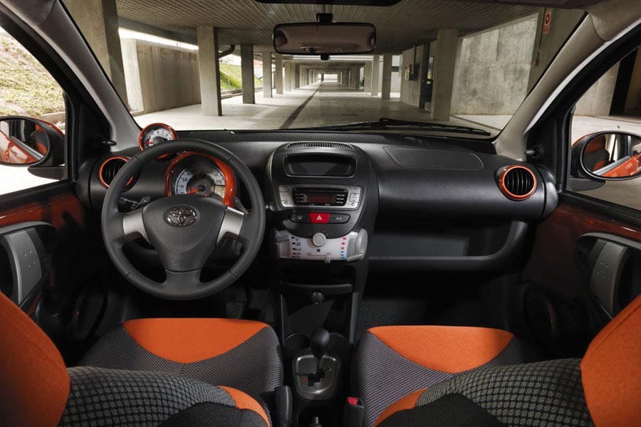 Περνώντας στο εσωτερικό του ανανεωμένου Aygo, οι αλλαγές που αντικρίζει κανείς εστιάζονται στις νέες επενδύσεις, στα πιο σκουρόχρωμα πλαστικά και στο ανασχεδιασμένο ηχοσύστημα. Ποιοτικά, παραμένουν τα μέτριας υφής σκληρά πλαστικά και οι «γυμνές» μεταλλικές επιφάνειες στο χρώμα του αμαξώματος που τονίζουν την λιτή του εικόνα. Επιπλέον διατηρήθηκαν κάποια εργονομικά λάθη, όπως τα όχι ιδιαίτερα χρηστικά χειριστήρια του air condition, o απουσία δεύτερου διακόπτη για το ηλεκτρικό παράθυρο του συνοδηγού (στην πόρτα του οδηγού) και τα πίσω παράθυρα που στο 5θυρο ανοίγουν μόνο προς τα έξω. Σε επίπεδο χώρων ο οδηγός και ο συνεπιβάτης θα φιλοξενηθούν με άνεση, ωστόσο πίσω είναι πιο «στριμωγμένο», αλλά σημαντικό μειονέκτημα αποτελεί ο μικρός (139 λτ.) και με ψηλό κατώφλι φόρτωσης χώρος αποσκευών.