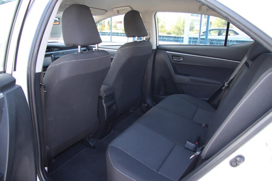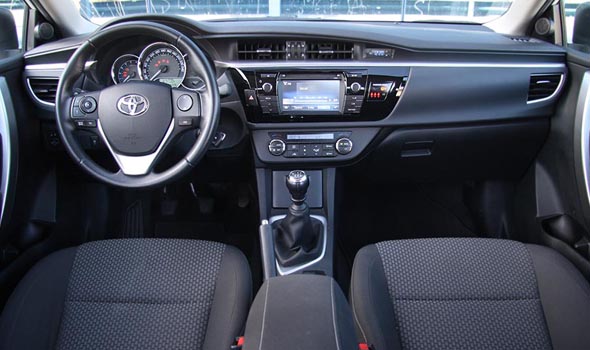 Το εσωτερικό του Toyota Corolla με την συντηρητική σχεδίαση κερδίζει τις πρώτες εντυπώσεις με τους άνετους χώρους του. Στο πίσω τμήμα της καμπίνας υπάρχει αρκετό διαθέσιμο πλάτος και πολύς αέρας για τα πόδια χάρη και στο μακρύ μεταξόνιο των 2,7 μέτρων, ενώ η έλλειψη του ψηλού τούνελ στο κέντρο διευκολύνει σημαντικά τη μετακίνηση ενός τρίτου ατόμου. Μεγάλο είναι και το πορτ μπαγκάζ των 452 λίτρων, ωστόσο οι τονισμένοι θόλοι των τροχών και τα μπράτσα του καπό (αντί π.χ. για αμορτισέρ) μειώνουν την πλήρη εκμετάλλευσή του. Στον τομέα της ποιότητας παρουσιάζεται προσεγμένο από πλευράς υλικών λόγω της χρήσης μαλακών στην υφή πλαστικών, ωστόσο στην συναρμογή είναι υπαρκτές μικροατέλειες. Πλήρης και με ευανάγνωστες ενδείξεις είναι ο πίνακας οργάνων, τα επιμέρους χειριστήρια είναι εύχρηστα, όπως και η οθόνη αφής 6,1 ιντσών του συστήματος πολυμέσων Toyota Touch2 (δεν περιλαμβάνεται στην αρχική έκδοση), ωστόσο το ψηφιακό ρολόι δεξιά στην κονσόλα εκτός από παλιομοδίτικο βρίσκεται και μακριά από το οπτικό πεδίο του οδηγού. Καλή είναι η θέση οδήγησης με τις πολλαπλές ρυθμίσεις για το αναπαυτικό κάθισμα και το τιμόνι.
