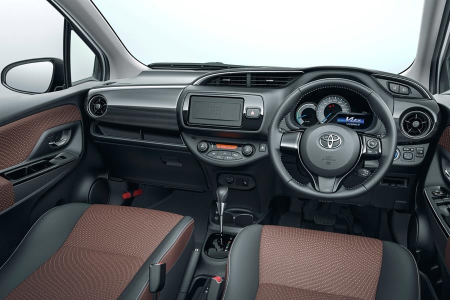 Στο εσωτερικό του ανανεωμένου Yaris οι αλλαγές εντοπίζονται στις νέες επενδύσεις και χρωματισμούς, τον επανασχεδιασμένο πίνακας οργάνων, το νέο επιλογέας ταχυτήτων και στους νέου σχεδιασμού αεραγωγούς.