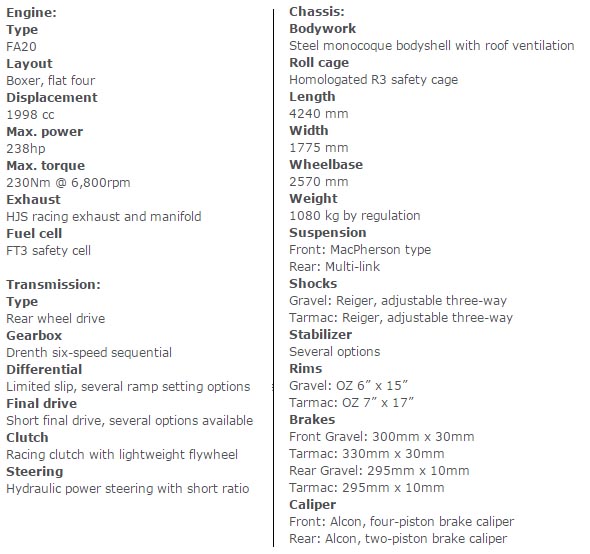 Για την τροφοδοσία του φροντίζει ο αναβαθμισμένος boxer κινητήρας των 2.0 λτ., με απόδοση 238 ίππων και 230 Nm ροπής, συνδυασμένος με σειριακό κιβώτιο 6 ταχυτήτων. Το πίσω διαφορικό είναι περιορισμένης ολίσθησης, εφοδιάζεται με κοντή τελική σχέση μετάδοσης, αγωνιστικό συμπλέκτη και πιο «γρήγορο» σε απόκριση υδραυλικό τιμόνι. Περισσότερες τεχνικές λεπτομέρειες αναφέρονται παρακάτω: