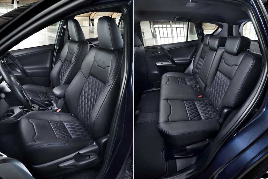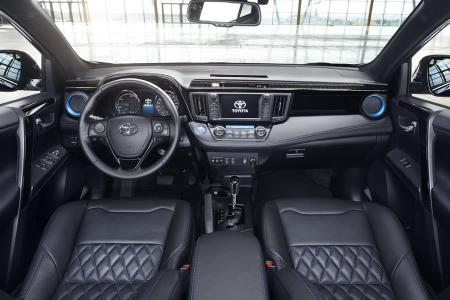 Ανάλογη εικόνα διαθέτει και το εσωτερικό του RAV4 Hybrid Sapphire όπου κυριαρχούν οι δερμάτινες επενδύσεις σε ταμπλό, πόρτες και καθίσματα με τις μπλε ραφές. Παράλληλα υπάρχουν διακοσμητικά μαύρης λάκας πιάνου και μπλε δακτυλίδια στους αεραγωγούς.