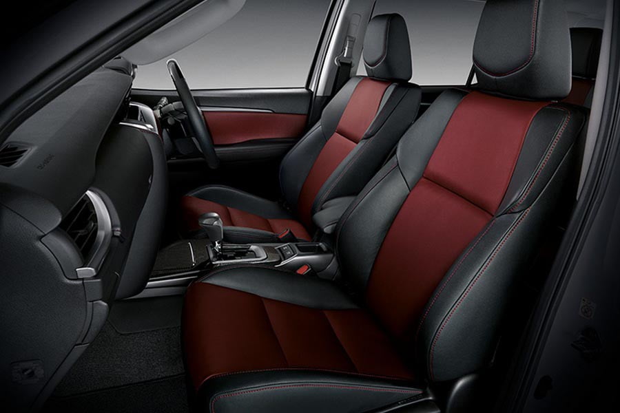 Αλλαγές έχουν γίνει και στο εσωτερικό του Fortuner TRD Sportivo, όπως είναι ο πιο σπορτίφ πίνακας οργάνων, οι δίχρωμες δερμάτινες επενδύσεις κόκκινου – μαύρου, τα διακοσμητικά απομίμησης ανθρακονήματος και το κόκκινο κουμπί εκκίνησης του κινητήρα.