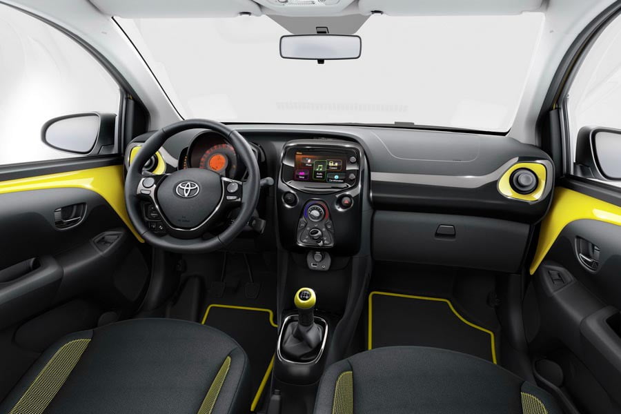 Στο εσωτερικό του Aygo x-cite κυριαρχεί και εκεί η διχρωμία του κίτρινου Yellow Fizz στα πλαίσια των αεραγωγών, στον επιλογέα των ταχυτήτων, στα πλαϊνά των καθισμάτων, στα πατάκια και στις πόρτες. Στον στάνταρ εξοπλισμό περιλαμβάνεται -μεταξύ άλλων- και η οθόνη 7 ιντσών του συστήματος πολυμέσων x-touch με ενσωματωμένη κάμερα οπισθοπορείας.