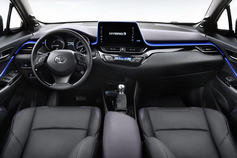 Η αισθητική του ακολουθεί τη νέα φιλοσοφία «Sensual Tech», όπου κυριαρχεί η μεγάλη οθόνη αφής των 8 ιντσών του συστήματος πολυμέσων στην κεντρική κονσόλα και τα λιγοστά επιμέρους χειριστήρια. Σύμφωνα με την Toyota, επειδή η οθόνη δεν ενσωματώνεται στην κονσόλα και είναι τοποθετημένη πάνω από αυτή, εξασφαλίζει έτσι χαμηλότερο βάθος στο ταμπλό και βοηθά περαιτέρω την ορατότητα του οδηγού. Σχεδιαστικά μοιάζει κάπως παράταιρη στο ταμπλό, ωστόσο μια συνοχή δίνει η μπλε επένδυση που διατρέχει τις πόρτες και το ταμπλό. Επιπλέον, το C-HR μπορεί να εξοπλιστεί με υψηλής ποιότητας ηχοσύστημα της JBL με απόδοση 576 Watt, 8κάναλο και με 9 συνολικά ηχεία.