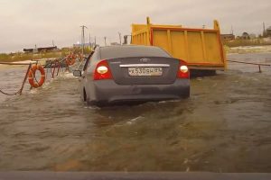 Στον ποταμό Nadym της Ρωσίας έχουν ξεκινήσει οι εργασίες κατασκευής μιας γέφυρας μήκους 1,5 χιλιομέτρου, ωστόσο μέχρι να ολοκληρωθεί έχει στηθεί μια πλωτή γέφυρα, η οποία μάλιστα αυτή την περίοδο έχει πλημμυρίσει. Παρόλα αυτά όμως οι οδηγοί ρισκάρουν να τη διασχίσουν θέτοντας την ζωή τους σε κίνδυνο, αφού είναι πολύ εύκολο να βουλιάξουν. Ενώ κάποιοι οδηγοί προσπαθούν να περάσουν προσεκτικά, υπάρχουν και κάποιοι ανεγκέφαλοι, όπως ο οδηγός του φορτηγού που προσπερνάει τα αυτοκίνητα, βουλιάζει και άλλο την γέφυρα μαζί και τα αυτοκίνητα που βρίσκονται στο πέρασμά του, τα οποία μετατρέπονται σε… πλεούμενα.