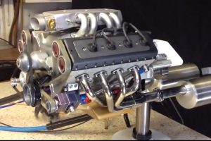 Ο κινητήρας – μινιατούρα με τους 8 κυλίνδρους σε V διάταξη είναι μόλις 45 κ.εκ. και λειτουργεί κανονικότατα. Για την κατασκευή του χρησιμοποιήθηκε ένας τόρνος ηλικίας 95 ετών και φυσικά πολύ μεράκι και τέχνη από το δημιουργό του. Ο μικροσκοπικός V8 των 45 κ.εκ. διαθέτει ηλεκτρονικό ψεκασμό καυσίμου (βενζίνη), δύο εκκεντροφόρους, μπεκ, μπλοκ αλουμινίου, χιτώνιο από χυτοσίδηρο, διπλή πεταλούδα, πολλαπλή εισαγωγής – εξαγωγής και γενικότερα ότι περιλαμβάνει και ένας μεγαλύτερος κινητήρας εσωτερικής καύσης. Ωστόσο, η ισχύς του δεν έχει γίνει γνωστή, όμως ο ήχος που παράγει είναι αν μη τι άλλο σπορτίφ…