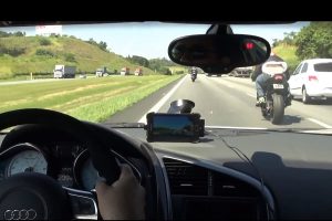 Ο οδηγός ενός βελτιωμένου Audi R8 V10 με 600 ίππους ενώ οδηγεί σε εθνική οδό «ψάχνεται» για κόντρες και βρίσκει δύο μοτοσικλετιστές, ο ένας με Kawasaki Ninja ZX 10R του 2008 με 188 ίππους και ο άλλος με Suzuki GSXR1000 του 2009 με 185 ίππους και ξεκινάει ο «αγώνας». Παρά τις συνεχόμενες παρακλήσεις της συνοδηγού που βρίσκεται στο Audi R8 να σταματήσει ο οδηγός την κόντρα αφού έχει φοβηθεί λόγω των επικίνδυνων ελιγμών που κάνει ανάμεσα στα αυτοκίνητα, εκείνος συνεχίζει ακάθεκτος μέχρι που θα πλησιάσουν σε διόδια και ουσιαστικά οι μοτοσικλετιστές βάζουν τέλος σε αυτή την κόντρα βλέποντας ότι ρισκάρεται η ζωή αυτών αλλά και των ανυποψίαστων υπόλοιπων οδηγών.