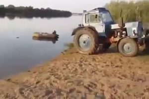 Μα τι… ψάρι είναι αυτό που χρειάστηκε τρακτέρ για να το τραβήξει από ποτάμι της Ρωσίας; Καμιά γιγάντια πέστροφα ή κανένας μεταλλαγμένος σολομός; Κι όμως πρόκειται για ένα σκληροτράχηλο εκτός δρόμου αυτοκίνητο που ίσως ήθελε να γίνει αμφίβιο αλλά τελικά δεν τα κατάφερε και παρασύρθηκε στο ποτάμι αφήνοντας τη βάρκα να πλέει από πάνω του…
