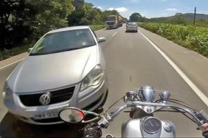 Ο οδηγός μοτοσικλέτας και φοιτητής από την Βραζιλία, Renan Ribas στάθηκε απίστευτα τυχερός την ώρα που απολάμβανε μαζί με έναν συνεπιβάτη την βόλτα του. Ξαφνικά λοιπόν, εκεί που οδηγούσε έρχεται κατά πάνω του από το αντίθετο ρεύμα ένα VW Polo sedan, ο οδηγός του οποίου έχει χάσει τον έλεγχο μετά από προσπέραση διπλής νταλίκας και ίσα που ακουμπάει το μοτοσικλετιστή χωρίς να τον ρίξει. Κατόπιν το Polo έπεσε σε ένα χαντάκι και φαίνεται πως άρχισε να παίρνει φωτιά, όμως γρήγορα οι περαστικοί και μετά τα μέσα διάσωσης έσπευσαν να βοηθήσουν. Σύμφωνα με αναφορά της τοπικής αστυνομίας οι τρεις επιβάτες του VW τραυματίστηκαν και μεταφέρθηκαν στο νοσοκομείο.