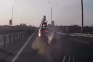 Τυχερός αλλά και ψύχραιμος σε απίστευτο βαθμό ήταν ο αναβάτης μιας μοτοσικλέτας, ο οποίος χτυπά με μεγάλη ταχύτητα πίσω από αυτοκίνητο και προσγειώνεται με τα πόδια στην οροφή σαν να ήταν ο καλύτερος ακροβάτης του κόσμου! Σίγουρα ούτε ο ίδιος ο ο μοτοσικλετιστής δεν θα πίστευε τι έκανε.