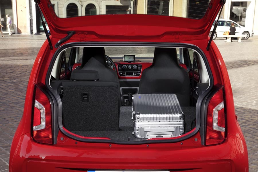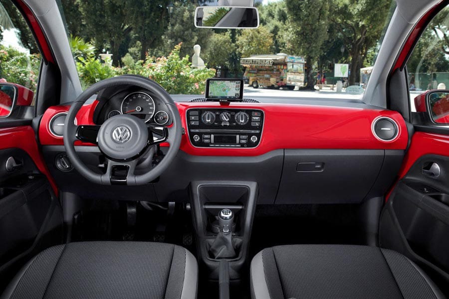 Ο θάλαμος επιβατών του up! με τις ευθείες γραμμές και τις επίπεδες επιφάνειες είναι αρκετά συγκρατημένος και συντηρητικός αισθητικά, αλλά και αρκετά λιτός σε επίπεδο διακόσμου. Τη μονοτονία «σπάει» το χρωματιστό τμήμα του ταμπλό που είναι ίδιας απόχρωσης με τις γυμνές μεταλλικές επιφάνειες του αμαξώματος. Οι τελευταίες δεν συμβαδίζουν με τα ποιοτικά στάνταρ που μας έχει συνηθίσει η VW, ωστόσο τα σκληρά πλαστικά είναι συμπαγή και με γεροδεμένη συναρμογή. Στον προαιρετικό εξοπλισμό ανήκει το αποσπώμενο σύστημα πολυμέσων maps+more, το οποίο περιλαμβάνει σύστημα πλοήγησης, πληροφορίες για το αυτοκίνητο, hands free κ.α. αλλά δε διακρίνεται για την ευχρηστία του και δείχνει σαν ξένο σώμα. Από την άλλη πλευρά η εργονομία των διαφόρων χειριστηρίων είναι πολύ καλή, όπως ισχύει αντίστοιχα και για την θέση οδήγησης. Μεγάλο πλεονέκτημα του εσωτερικού του up! είναι οι άνετοι χώροι για 4 επιβάτες και τις αποσκευές (251 λτ.) που είναι επιπέδου μικρού αυτοκινήτου και όχι μίνι 3,5 μ. μήκους.