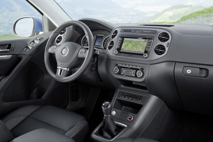 To εσωτερικό του Tiguan BlueMotion είναι γνώριμο εφαρμόζοντας στοιχεία που έχουμε γνωρίσει και σε άλλα μοντέλα της εταιρείας, ενώ διακρίνεται για το υψηλό επίπεδο ποιότητας και τη στιβαρή συναρμογή των επιμέρους τμημάτων. Ο διάκοσμος είναι ευχάριστος με τον οδηγό να απολαμβάνει άνετη και υψηλά τοποθετημένη θέση οδήγησης και πολύ καλή εργονομία. Οι χώροι εξυπηρετούν με ευκολία 4 επιβάτες οι οποίοι δεν θα χρειαστεί να κάνουν καμία παραχώρηση, ωστόσο ο χώρος αποσκευών με όγκο 360 λίτρων κρίνεται μέτριος. Ωστόσο αν χρειαστεί μπορεί να αυξηθεί στα 470 λίτρα μέσω της δυνατότητας μετακίνησης του πίσω συρόμενου καθίσματος (σύρεται σε μια διαδρομή 16 εκατοστών ενώ ρυθμίζεται και η κλίση της πλάτης, σε γωνία 23 μοιρών). Τον άνετο οικογενειακό προσανατολισμό του Tiguan ενισχύουν τέλος οι πολλές και μεγάλες σε χωρητικότητα θέσεις για μικροαντικείμενα.