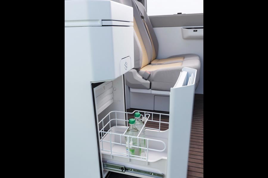 Στα χαρακτηριστικά άνεσης του VW California XXL περιλαμβάνεται και ο ενσωματωμένος προτζέκτορας στο πίσω μέρος, που συνδυάζεται με ειδικό κρυφό φωτισμό για να δημιουργηθεί η απαραίτητη ατμόσφαιρα. Επίσης, το τροχόσπιτο διαθέτει και ενσωματωμένη μηχανή εσπρέσσο.