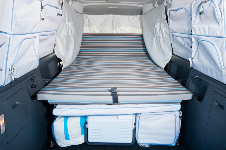Η Volkswagen παρουσίασε το ειδικά διασκευασμένο Caddy Maxi Camper, το οποίο όπως υποδηλώνει η ονομασία του προσφέρεται για διακοπές σε κάμπινγκ και είναι εξοπλισμένο με πτυσσόμενο διπλό κρεβάτι, δύο “σπαστές” καρέκλες, φορητό τραπέζι, μικρό ψυγείο και την απαραίτητη τέντα. Βέβαια όλα αυτά τα αποθηκεύονται σε ειδικούς χώρους έτσι ώστε να μην μετακινούνται κατά την κίνηση του οχήματος. Επιπλέον το… δωμάτιο του Caddy εφοδιάζεται με κουρτινάκια στα παράθυρα για τα αδιάκριτα βλέμματα, η τέντα εφαρμόζει στην πίσω πόρτα και εξασφαλίζει ένα πρόσθετο υπαίθριο χώρο, ενώ στην οροφή υπάρχουν θέσεις για μεταφορά ποδηλάτων.